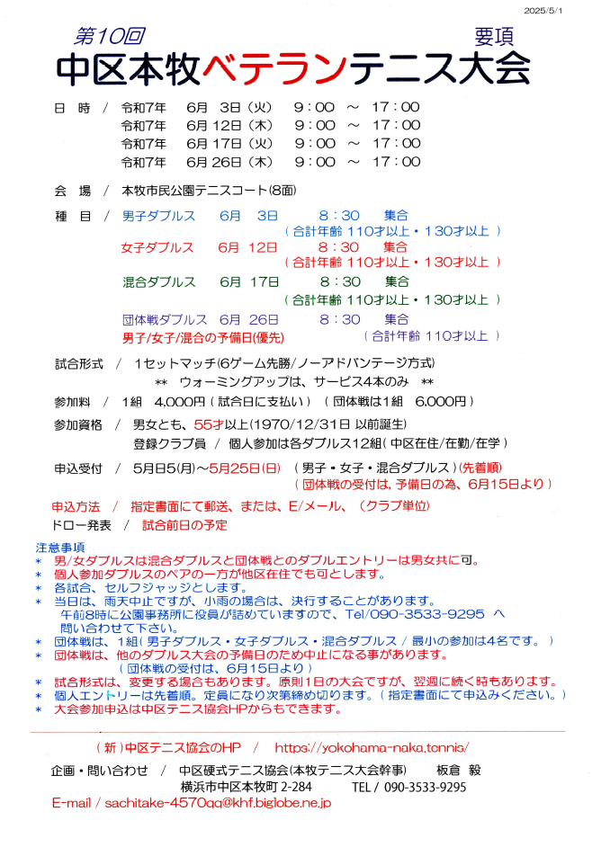 テニス大会 2023.05.222025.06.24 第42回中区テニス大会が下記要項の内容で開催されます。奮ってご参加下さい。 中区本牧ベテランテニス大会 第10回中区ベテランテニス大会が下記要項の内容で開催されます。奮ってご参加下さい。 次へ 123