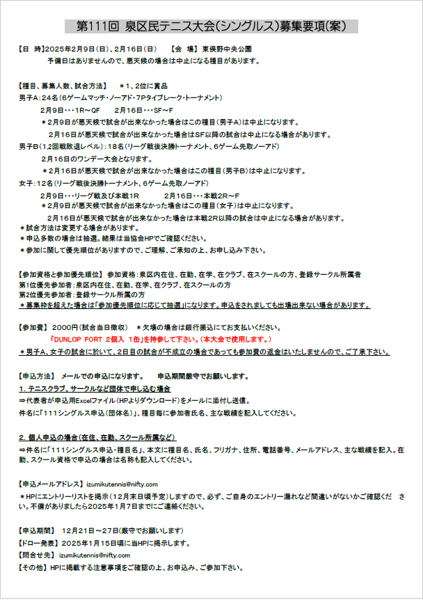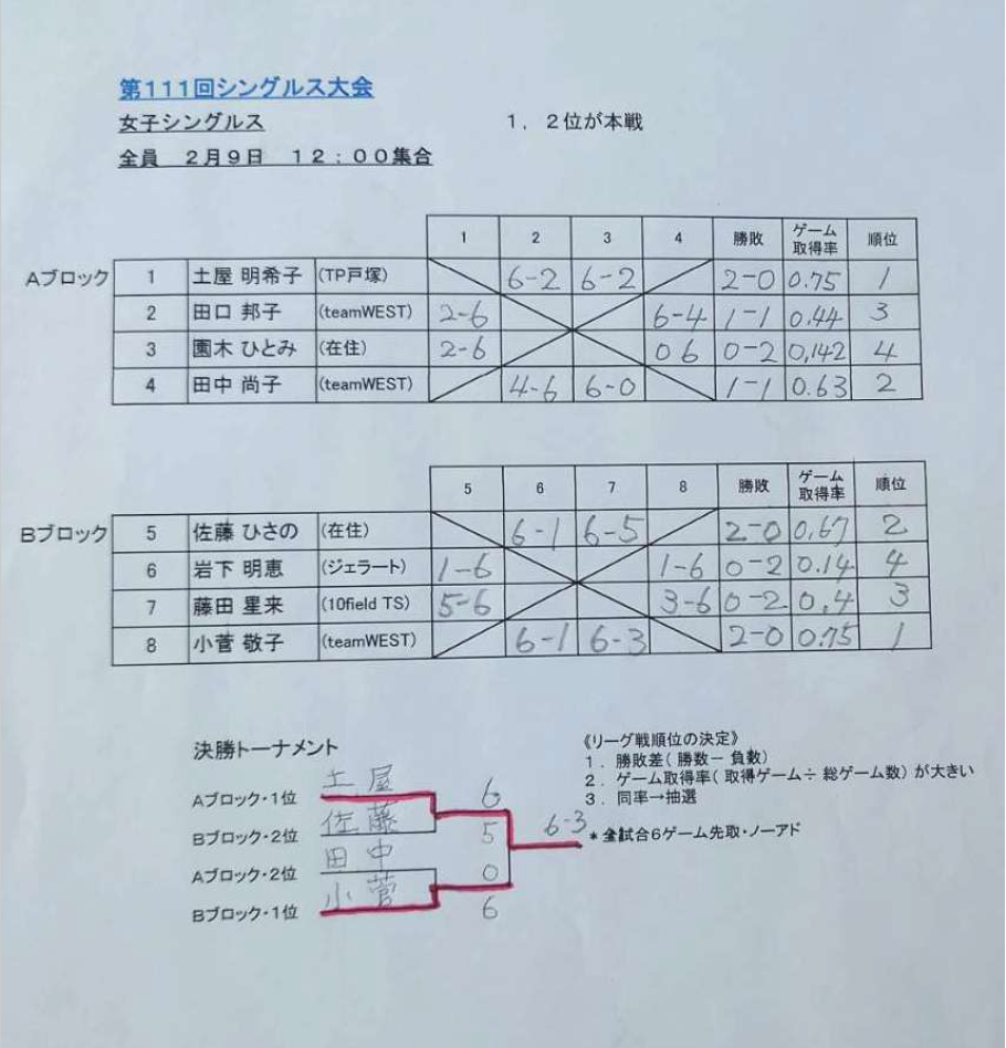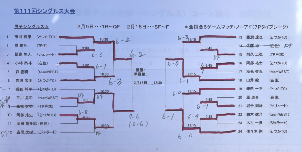 テニス大会 2023.05.222025.06.24 第111回泉区民テニス大会(シングルス) 2/9(日)男子Aの試合結果SF、Fは2/16(日)になります。 2/9(日)女子ABブロック シングルスの結果 前へ次へ 123
